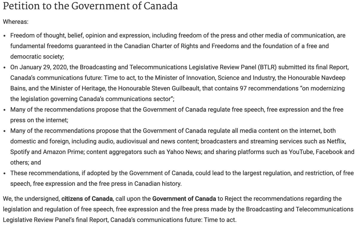 Petition launched in House of Commons on the broadcast panel report calling on the government to “reject the recommendations regarding the legislation and regulation of free speech, free expression and the free press.” Backed by @MichaelChongMP@twitter.com #BTLR https://petitions.ourcommons.ca/en/Petition/Details?Petition=e-2418