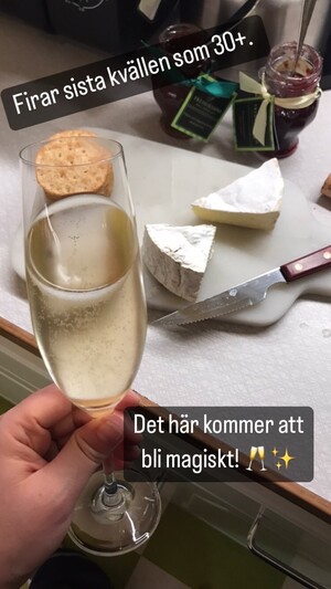 (Bild pÄ en champagneflöjt med bubbel, i bakgrunden finns en marmorbricka med ost och kex, brevid stÄr marmelader) #ost #bubbel #fredagförfan