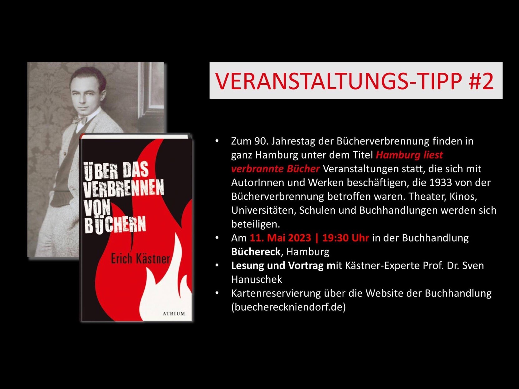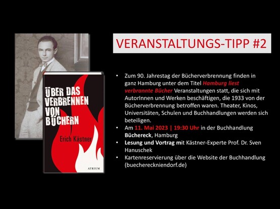 Zum 90. Jahrestag der #Bücherverbrennung findet in ganz #Hamburg unter dem Titel „Hamburg liest verbrannte Bücher“eine ganze Reihe von Veranstaltungen statt, die sich mit AutorInnen und Werken beschäftigen, die 1933 von der Bücherverbrennung betroffen waren.