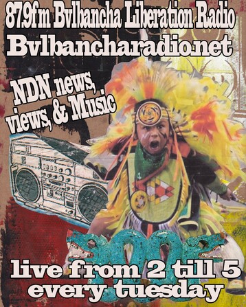 It is happening again. Bvlbancha Liberation Radio 87.9fm. Bvlbancharadio.net. centering Native voices. Reclaiming our headspace. Rock, Hip-Hop, Jazz, traditional, Powwow, Powwow Step, news, views, thoughts... Full-blooded, Meztizo, Melungeon, Creole, Chicano, Black Indians. Native voices for reclaiming Turtle Island.