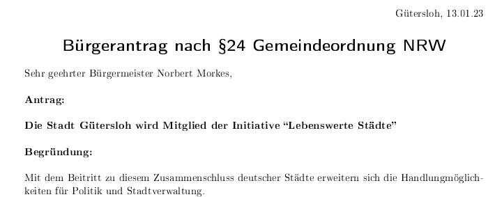 Wir haben eine #Bürgerantrag gestellt, dass die Stadt #Gütersloh Mitglied bei der Initiative Lebenswerte Städte werden soll: