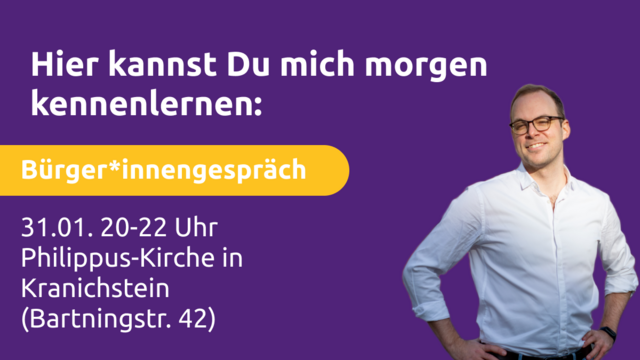 Hey Du!✌️ Wohnst Du in #Darmstadt? Dann komm doch morgen Abend zu meiner #BürgerInnensprechstunde und stell mir Deine Fragen zu meiner OB-Kandidatur und meinen Vorhaben für Darmstadt.