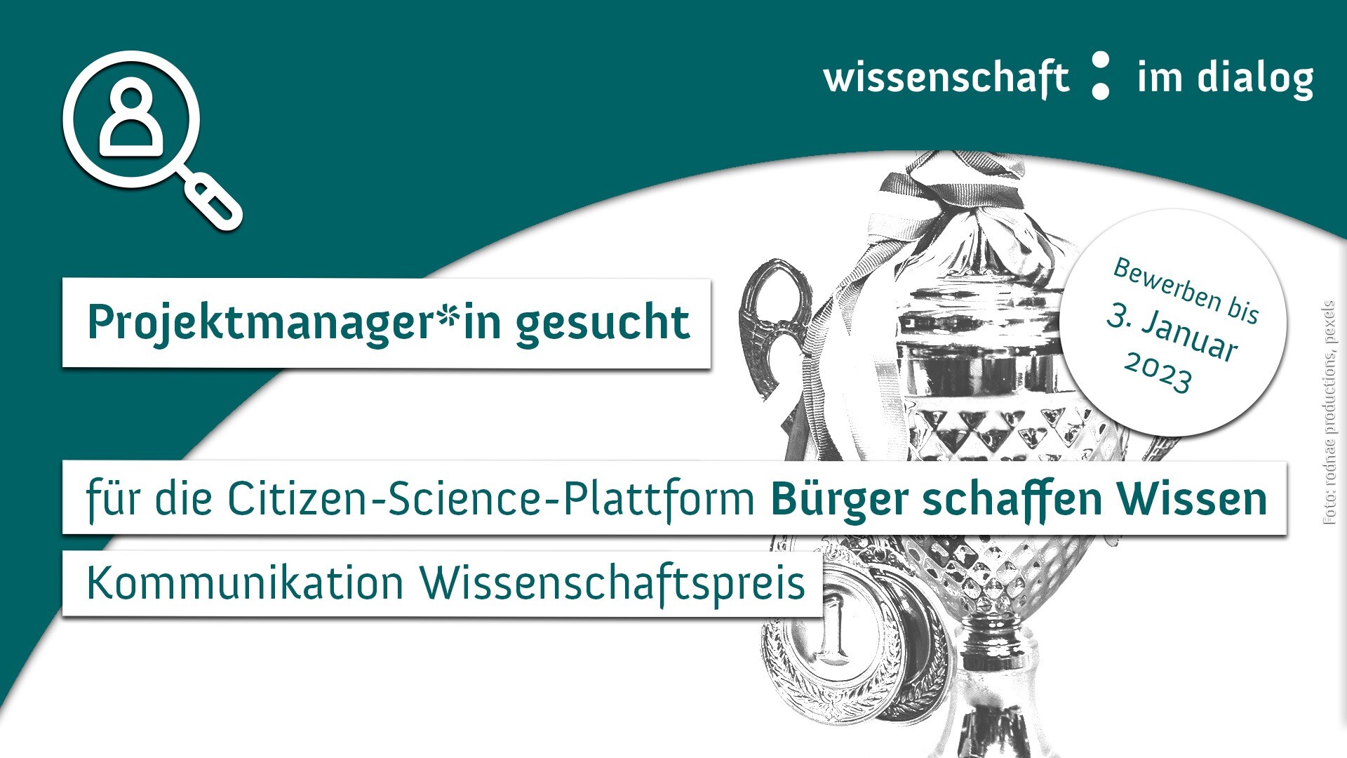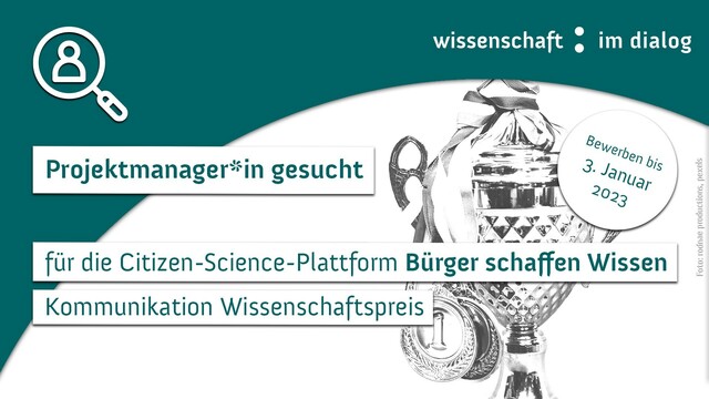 Wir suchen eine*n Projektmanager*in, die in den Bereichen Kommunikation und Veranstaltungsorganisation unser Team der #CitizenScience-Plattform "Bürger schaffen Wissen" unterstützt. Begleite die Konzeption eines neuen #Bürgerwissenschaft-Preises, verleihe der Kommunikation deine Handschrift und wirke an verschiedenen Veranstaltungen mit. Wir freuen uns auf deine Bewerbung bis zum 3. Januar 2023. Weitere Infos findest du hier: