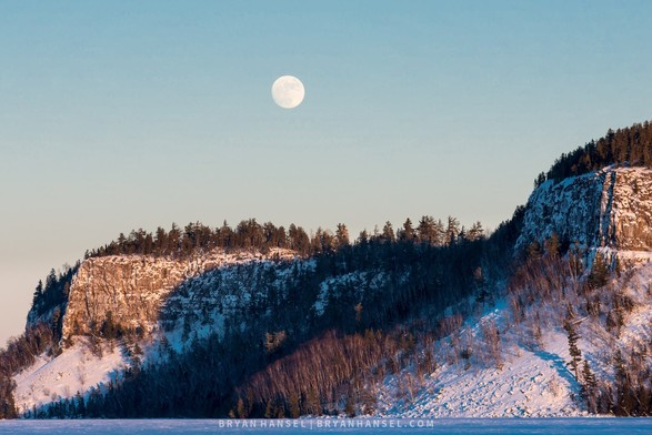 The Wolf Moon rises over the cliffs on Clearwater Lake near the BWCAW, Minnesota.