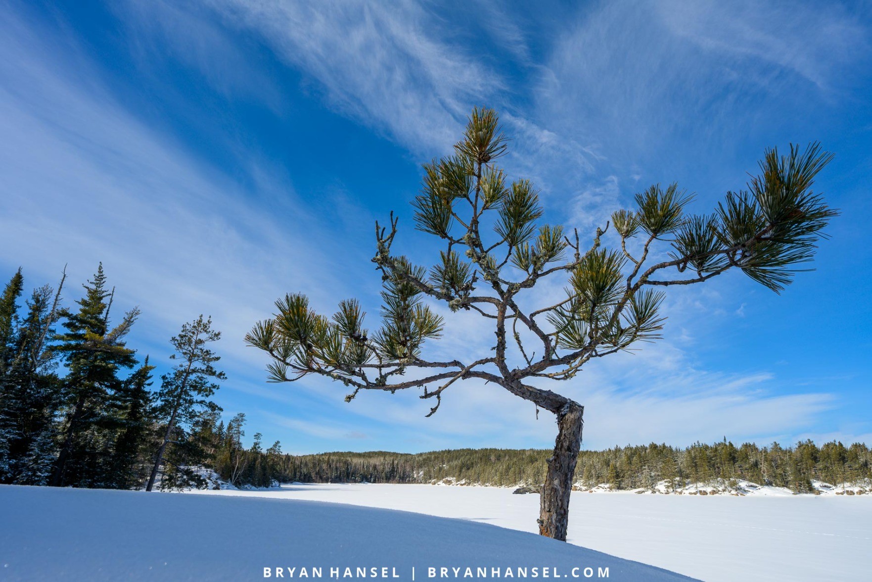 I spent most of yesterday on the Gunflint Trail. Road conditions up there are icy, but the snow is nice. It's generally solid with a little powder on top. That made snowshoeing off the trails easy. I decided to hike to this little pine tree that I like to photograph. The blue sky was awesome.
