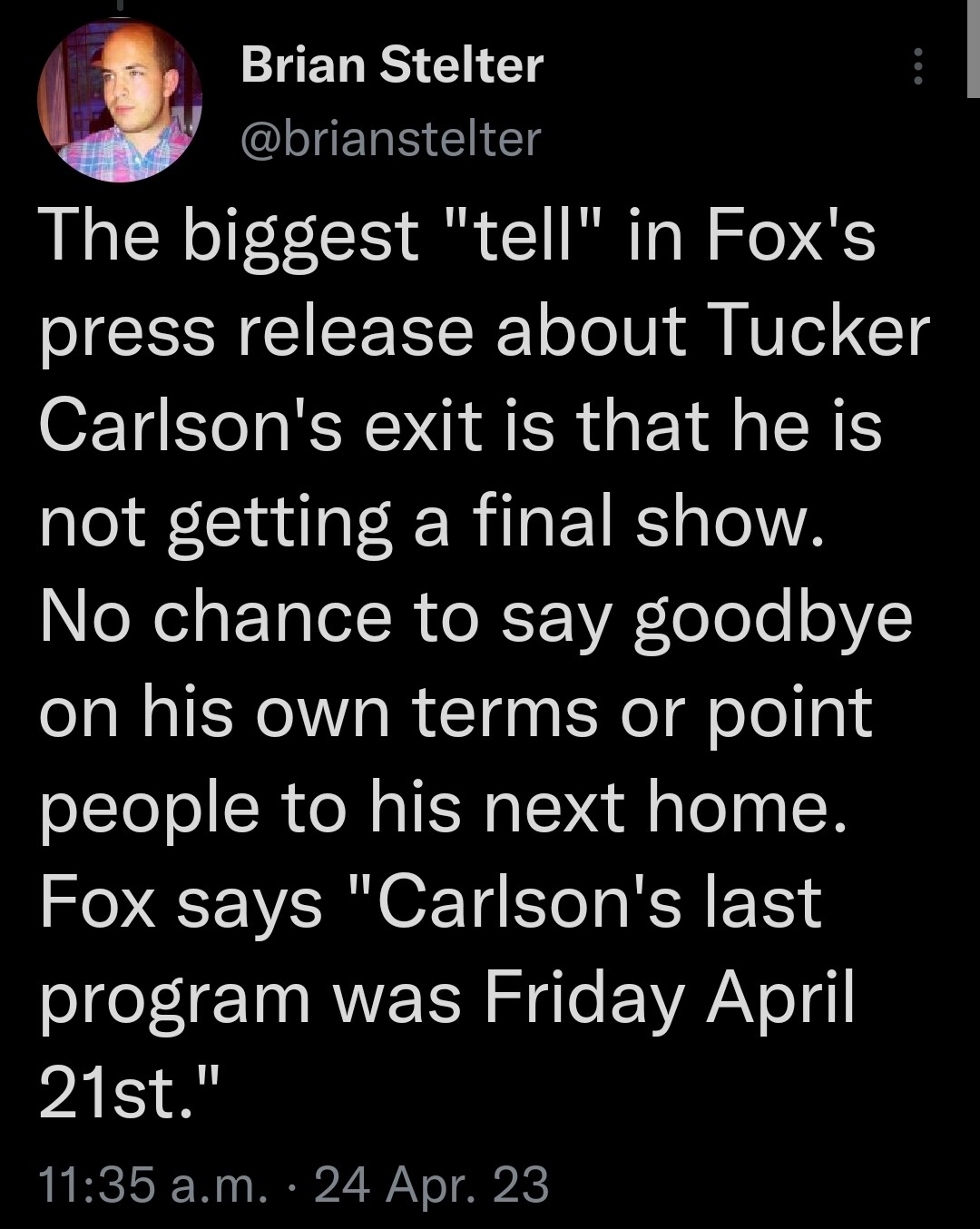 «The biggest "tell" in Fox's press release about Tucker Carlson's exit is that he is not getting a final show. No chance to say goodbye on his own terms or point people to his next home. Fox says "Carlson's last program was Friday April 21st."»