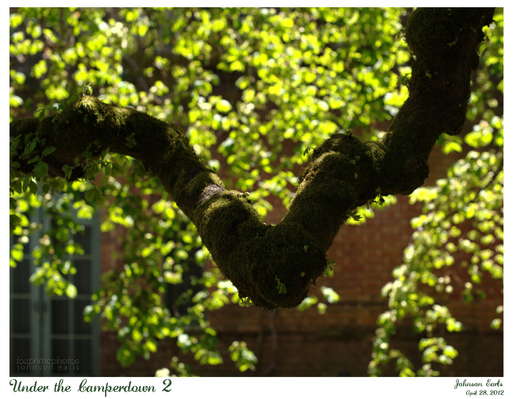 Looking out from behind a blooming Camperdown Elm Portland Heritage Tree at the Poulsen House.