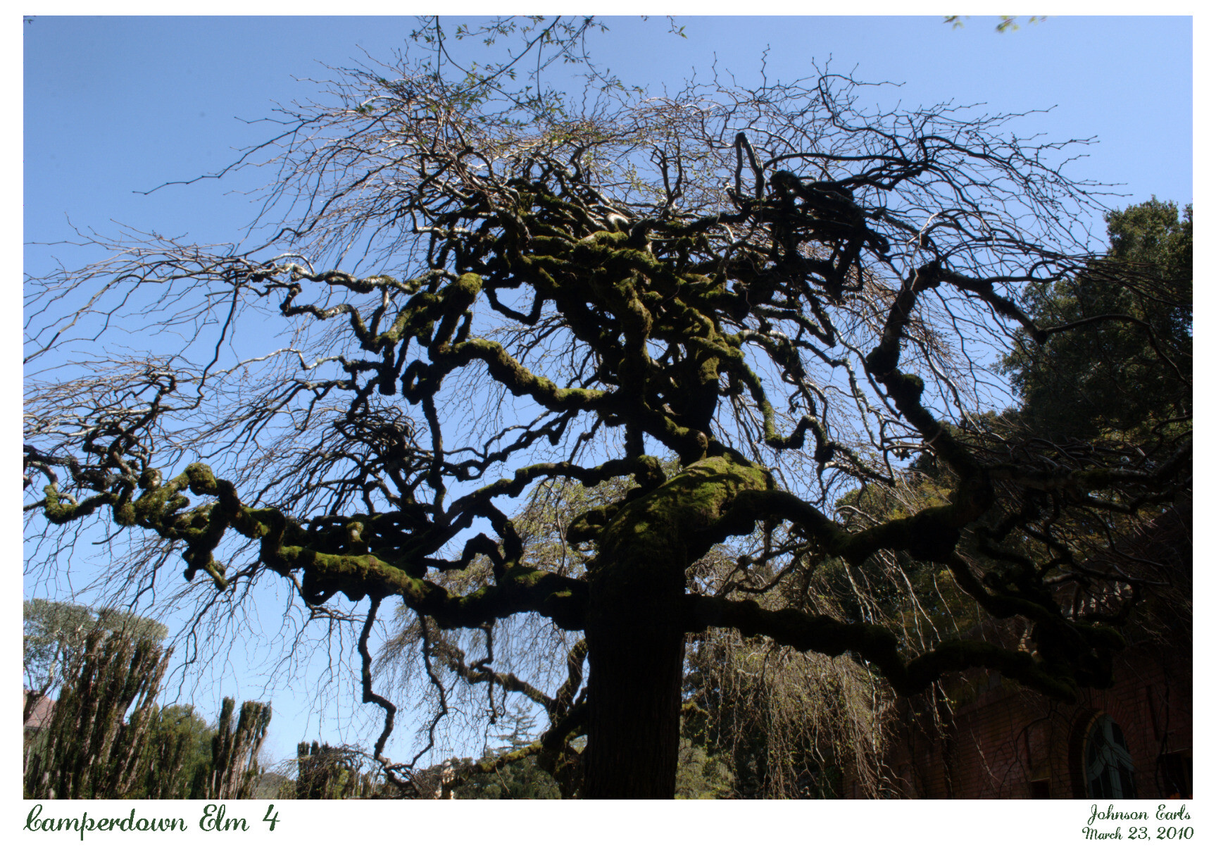 For #MossMonday, a picture taken from underneath one of the two Camperdown Elm trees in the Filoli estate. The gnarled branches of this tree are covered in moss.