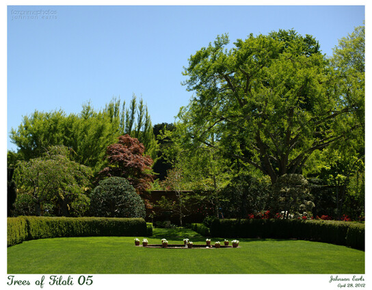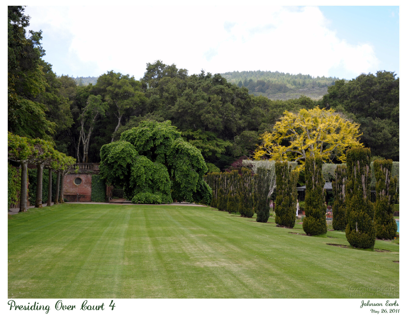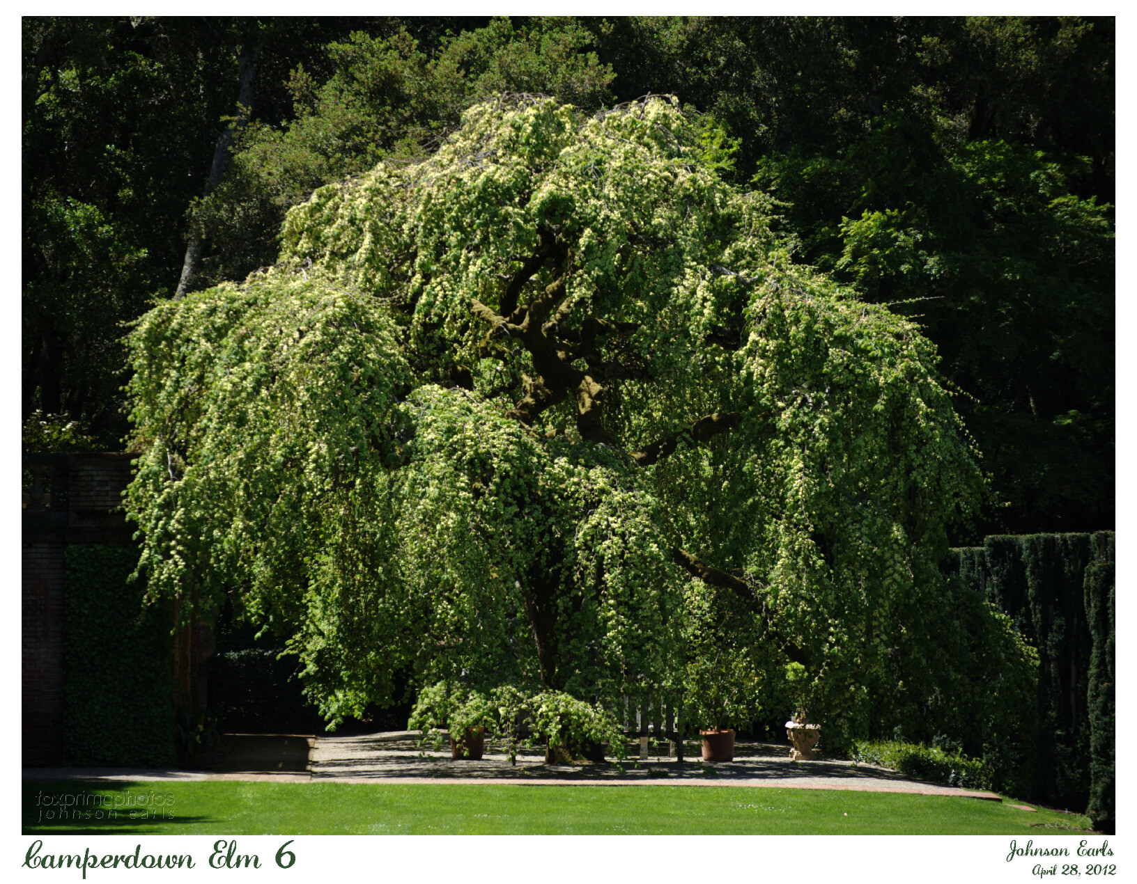 For a (hidden) #ThickTrunkTuesday, here is "the" Camperdown Elm, the same as from last week and from my intro post, presiding over the end of the Filoli estate's bowling green, this time in full springtime foliage. On the right side you can also see the brilliant yellow leaves and white branches of the Sunburst Honey Locust tree which, unfortunately, was near its life expectancy; it became diseased and had to be removed a few years after this was taken.