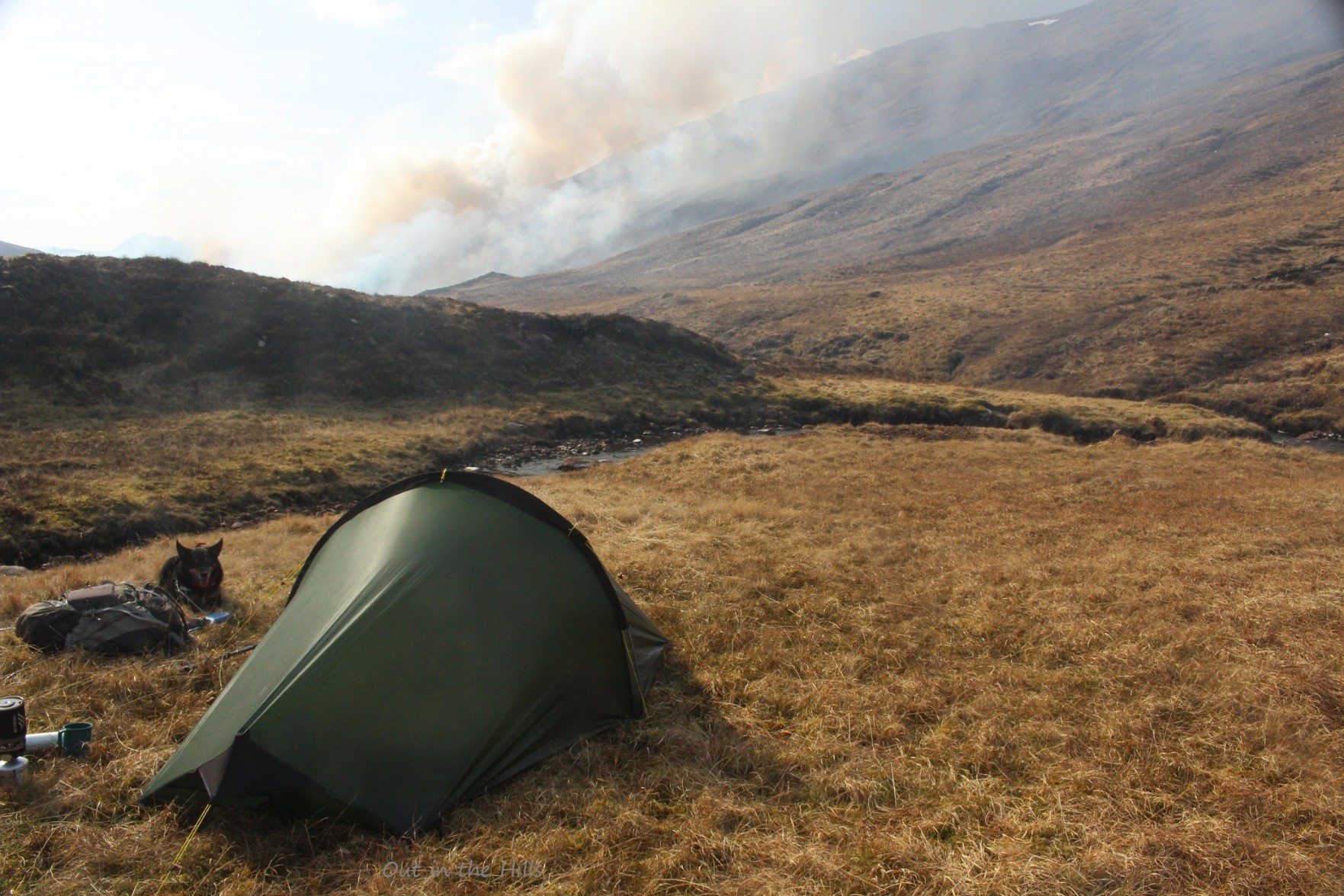 March: camped above Iron Lodge, came back from An Socach to find uncontrolled muirburn nearby.