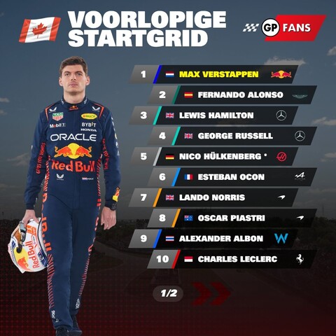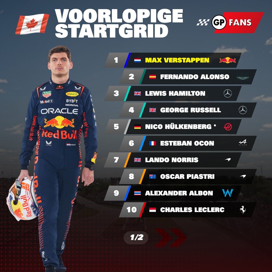 De voorlopige startgrid voor de Grand Prix van Canada ziet er - dankzij gridstraffen voor Carlos Sainz, Yuki Tsunoda, Lance Stroll en Nico Hülkenberg - als volgt uit.