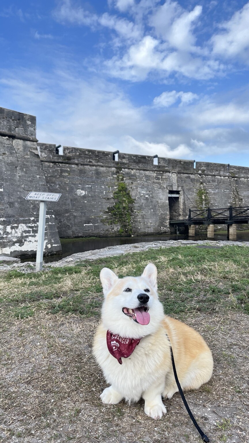 #corgi pic from #staugustine this afternoon. #NoDogsAllowed in the old Spanish fort. Off to #canaveral tomorrow for the launch of #artemis