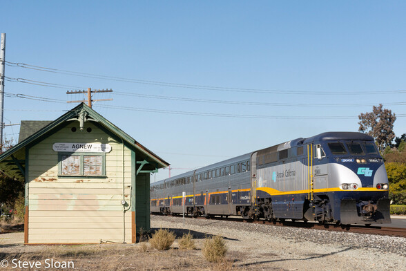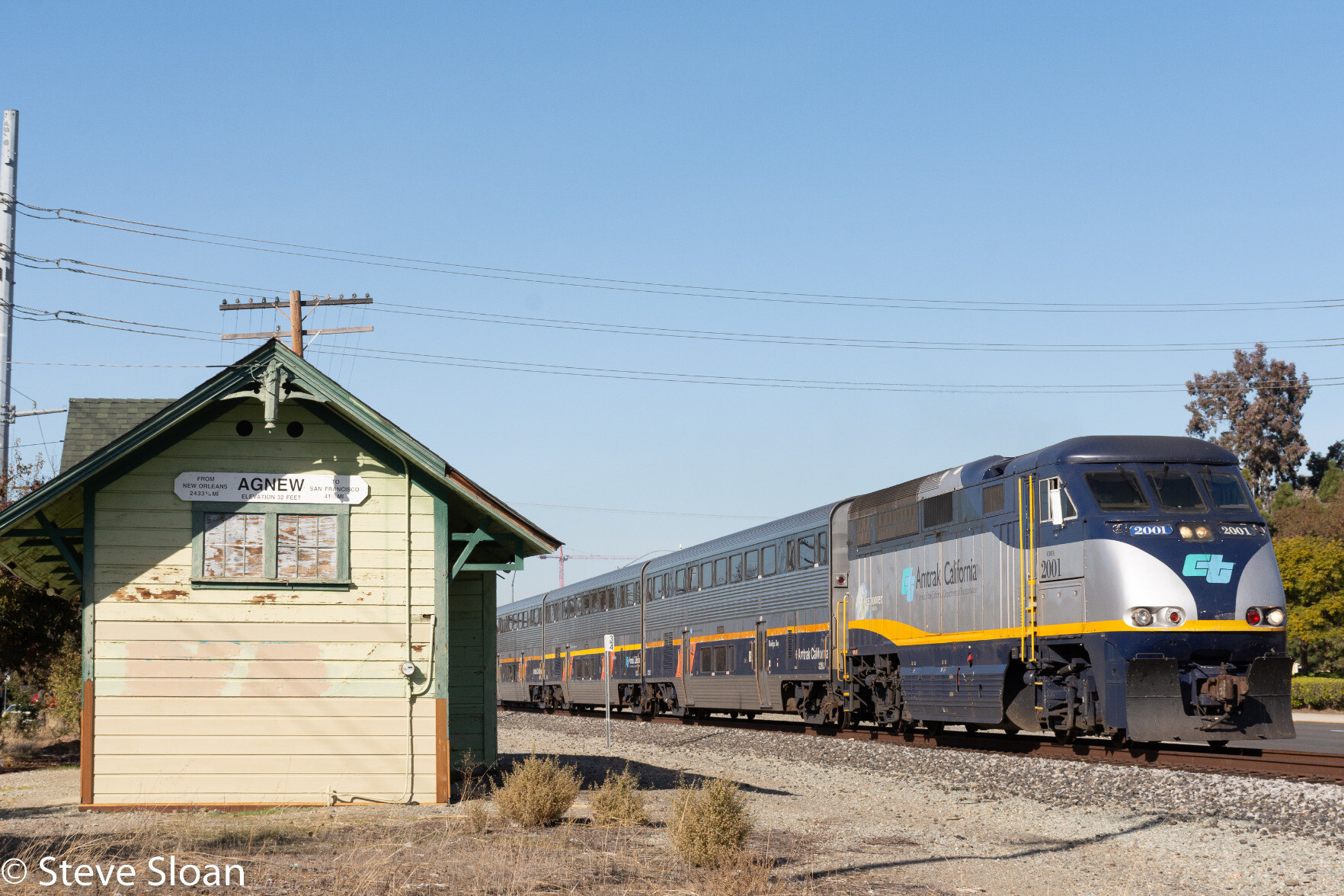 On Wednesday, November 23, 2022, a late Capitol train 532, led by California Department of Transportation (CDTX) 2001, passes the Agnew depot, in Santa Clara, California, at 12:50 p.m. CDTX 2001 is an EMD F59PHI.