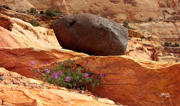 Capitol Reef National Park, Utah - This black boulder and purple flowers in a sea of red caught my eye!