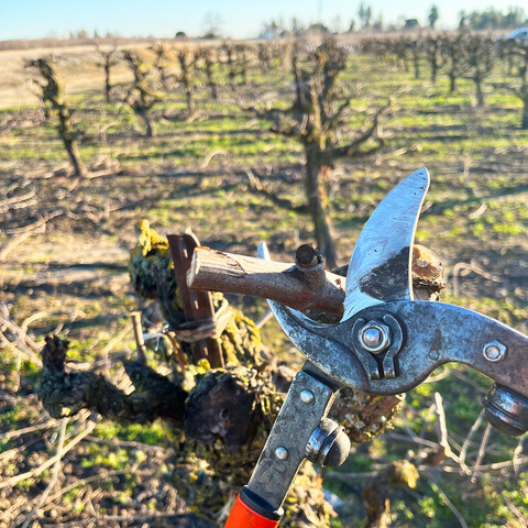 Using this muddy break between rivers to get pruning done on the Ancient Vine #Carignane at Church Block in #Lodi #wine country. It's Markus's form of meditation to solve the puzzle of cuts for each vine himself every January.