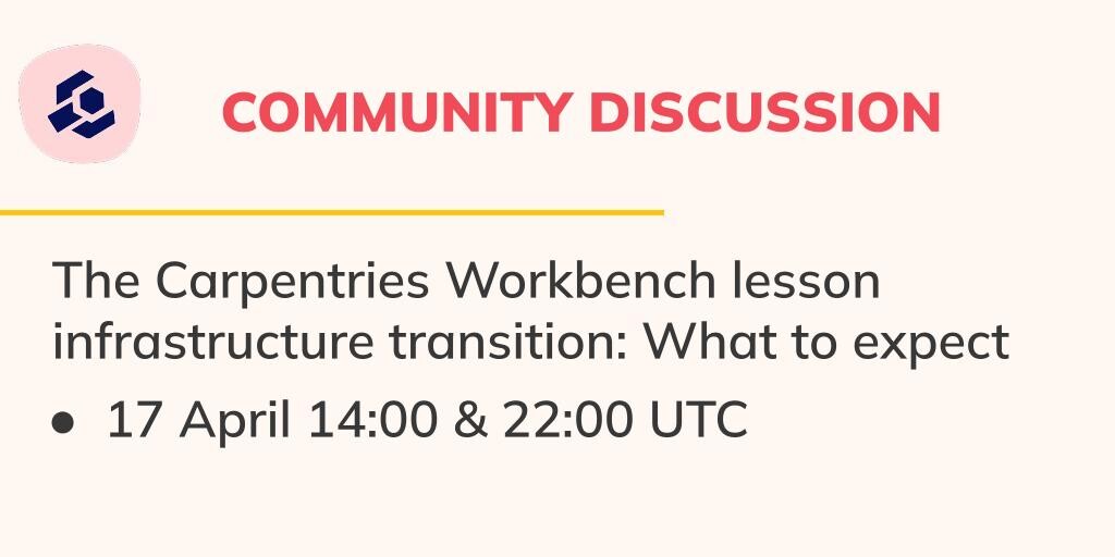 Are you curious about the #CarpentriesWorkbench? Join @zkamvar on Monday, 17 April 14:00-15:00 and 22:00-23:00 UTC for a Carpentries Community Discussion all about The Workbench, including what to expect and how to get your questions answered. Details: https://pad.carpentries.org/community-discussions