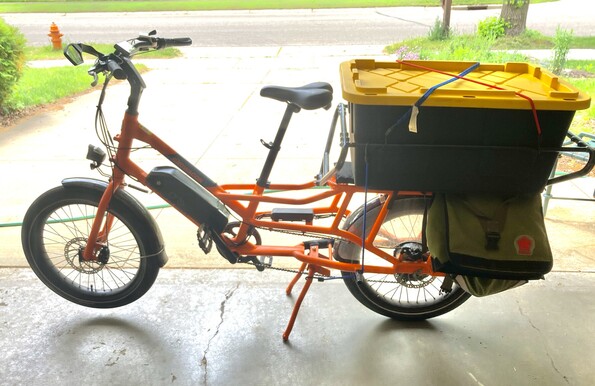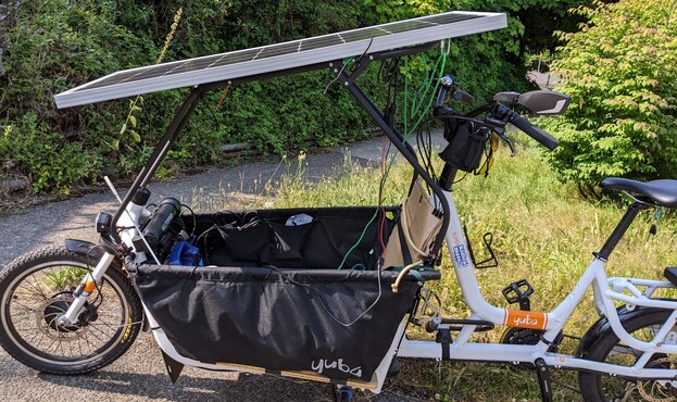 Not going to ride like this (18lb is too heavy, needs a flexible panel and some stiff backer) but it's charging at around 50W with 100W panel (the solar pack being a limiting factor) and I like the size of it for a summer roof. #solar #eBike #cargoBikes #carReplacement