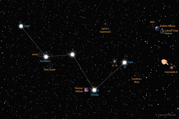 It is located slightly to the right of the W-shaped Cassiopeia constellation.