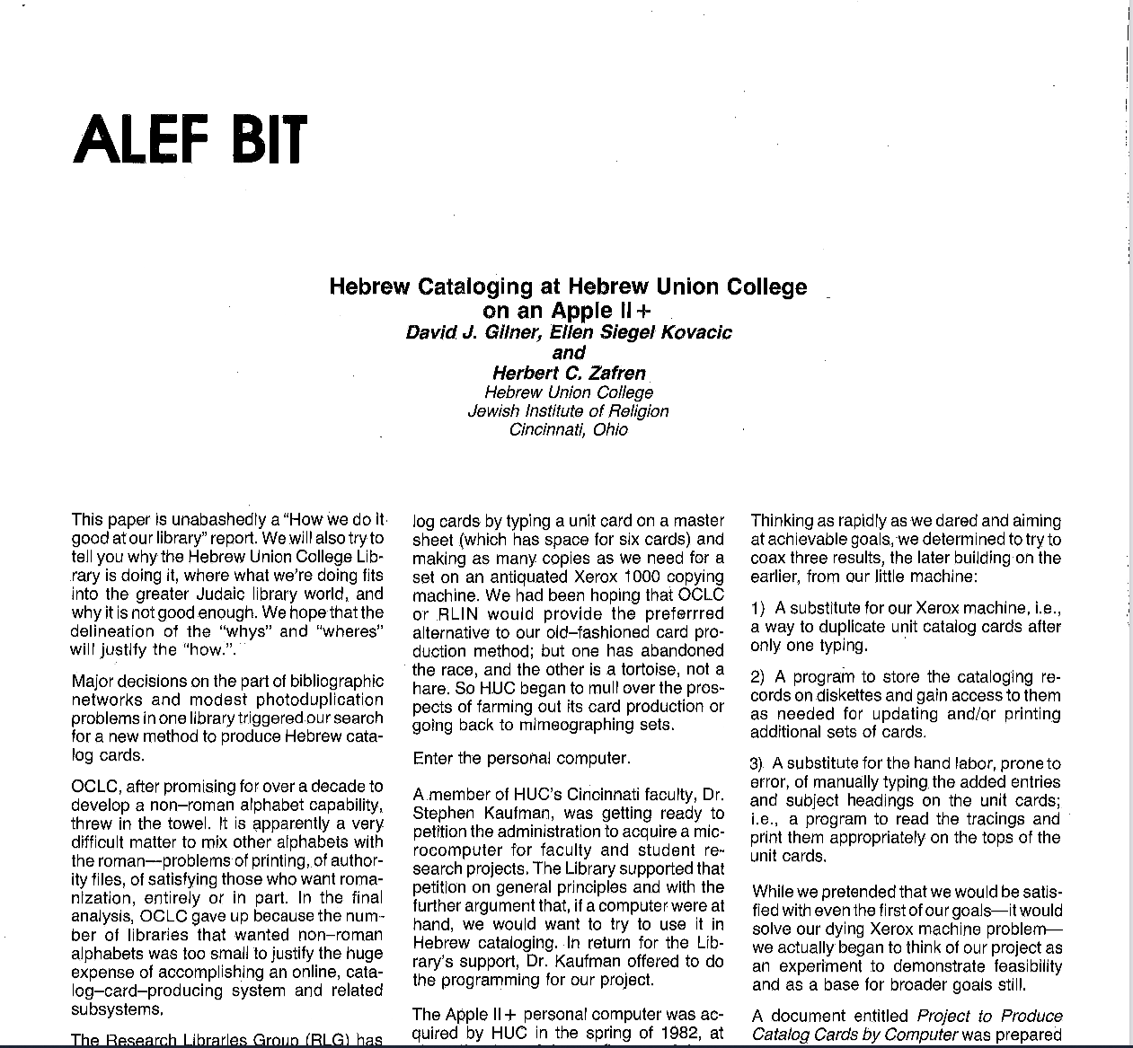 Love this, from the very first issue of Judaica Librarianship - cataloging in Hebrew characters using an Apple II at HUC (1983): https://ajlpublishing.org/index.php/jl/article/view/737/653
