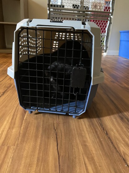 16 more days until this one’s first vet visit in over a year. Now, when I come into the room with the crate, I toss a few treats into it and he climbs right in. Today, I closed the door twice (!!!) and even picked the crate up once.
