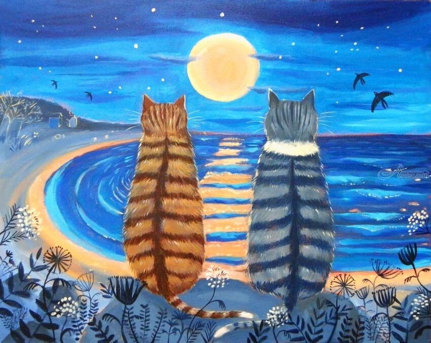 #cats #CatsOfMastoadon #art #painting #mastoart #AYearForArt #moon #ocean