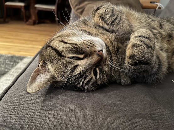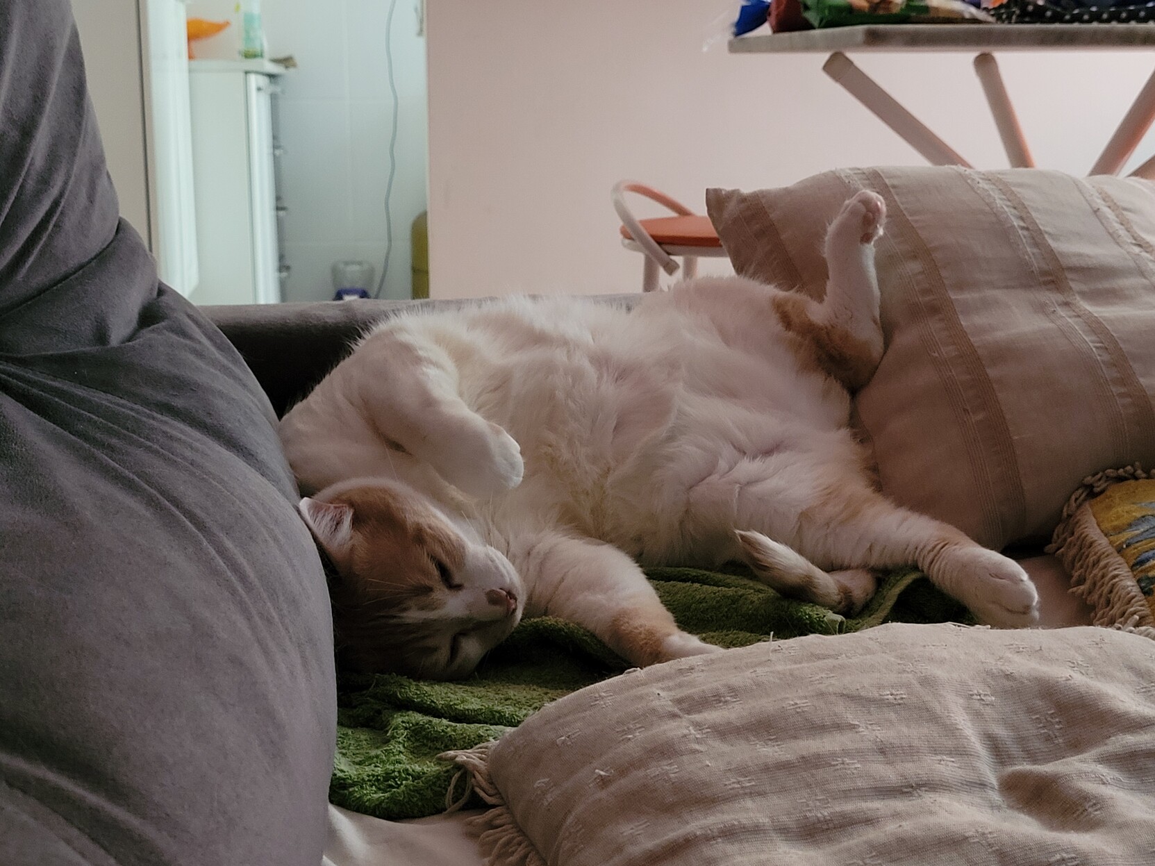 Eu já tinha visto esse rolê de postar foto de gato no sábado, mas sempre esqueço, então fica aí hoje a minha contribuição com uma foto do Capucho largado no sofá 😝 #caturay #catsofmastodon
