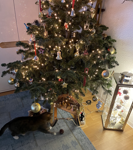 Die Katze darf anfangen, den Baum zu entschmücken 🙄🙈