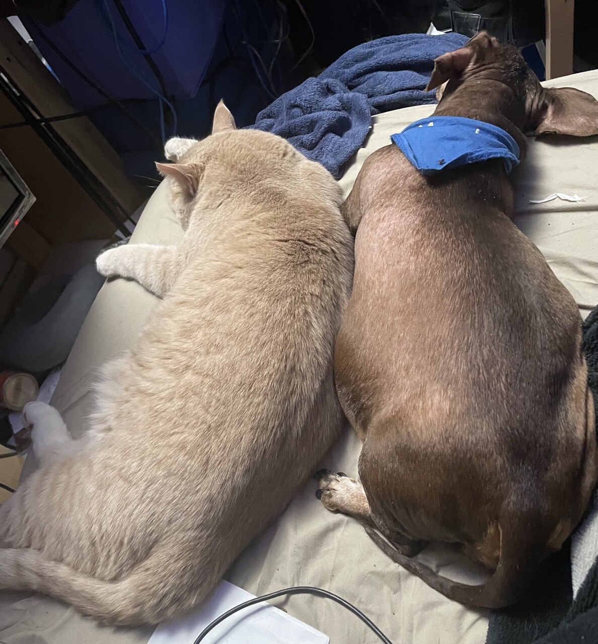 Chiron (pronounced Kyron) AKA DOG4 sharing a bed with canine Mandy. #caturday #caturdaydog #catsofmastadon