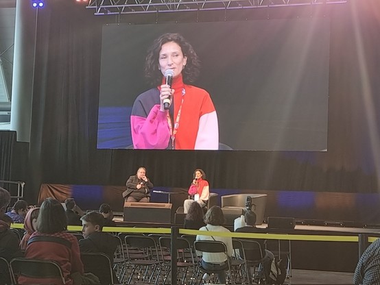 Indira Varma on stage at #CCON, with Vivien Lyra Blair in the front row wearing a bunny hat. Some fun banter shared as well about how actors should never work with children or animals, but that this child dressed as an animal was quite alright.