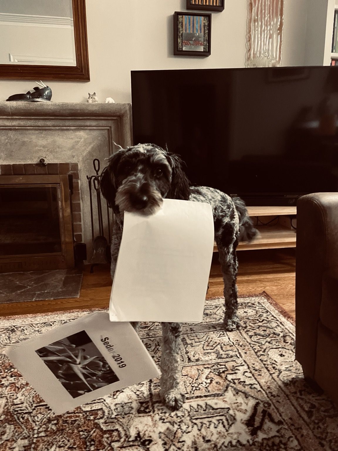 At our seder, #Passover is about social justice, human rights throughout history. Religious, cultural, linguistic freedom. Freedom to express sexuality, gender identity. A right to live in peace, with dignity. To our puppy, though, the Haggadah is just a fun time. (Photo this morning. Last time we updated our Haggadah, 2019). #ChagSameach