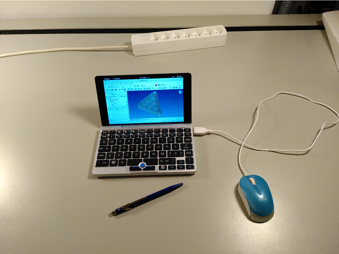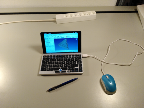 The world's smallest CAD workstation, running @FreeCAD on #Gentoo on a GPD pocket at the #ChaostreffBern.