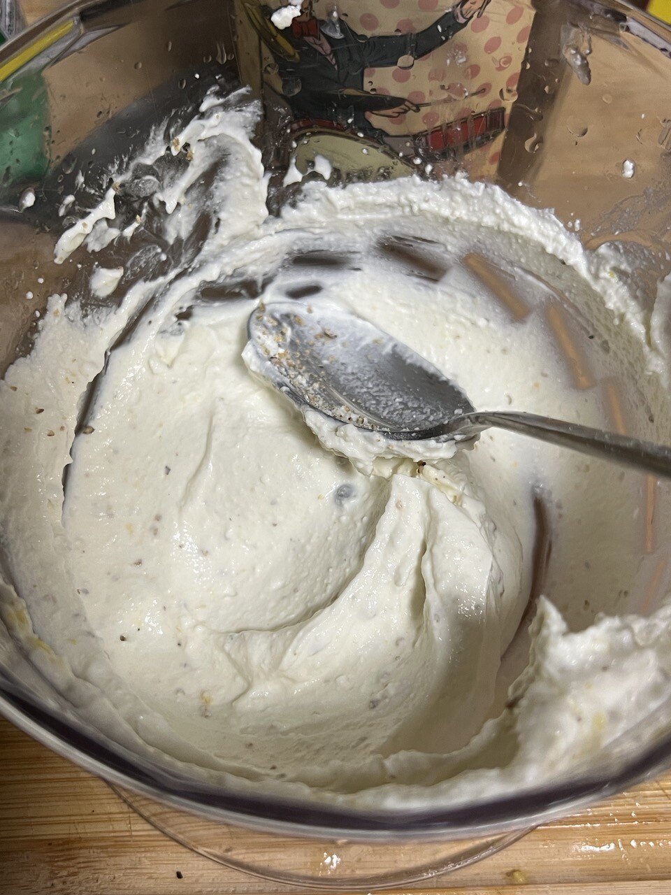 Now here’s the “cream cheese” I make from it — just purée it with some salt! But I add lemon juice, sea salt, white pepper, blitz it, then add lemon zest.