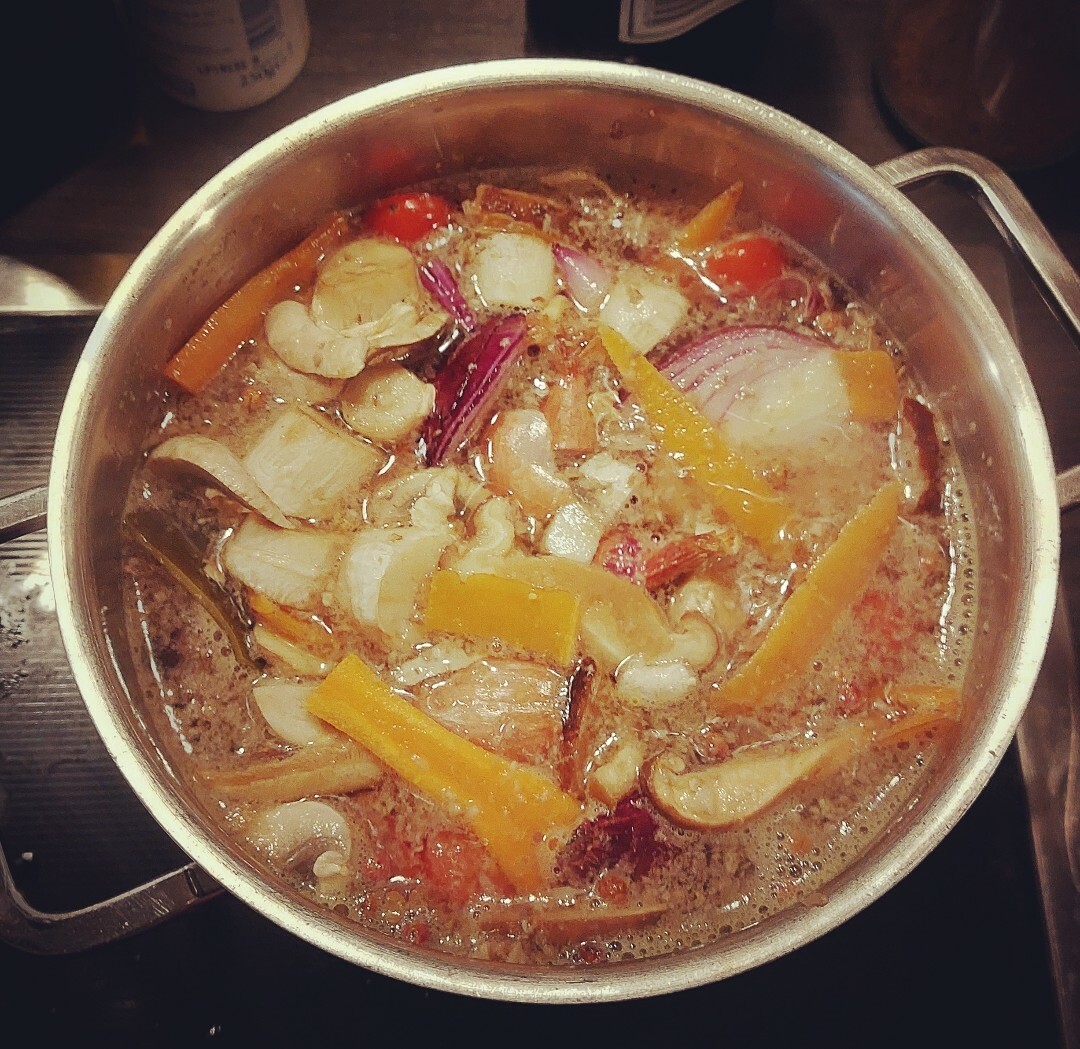Aus Gemüseresten und ein bisschen anderem Kram Ramenbrühe gekocht.