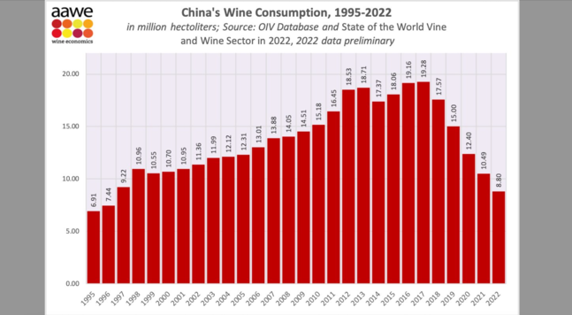 2022 data show further dramatic decline. From its peak in 2017, China's Wine consumption has decreased by more than 54%. Lowest consumption since 1996. #chinaeconomy #chinamarket #china