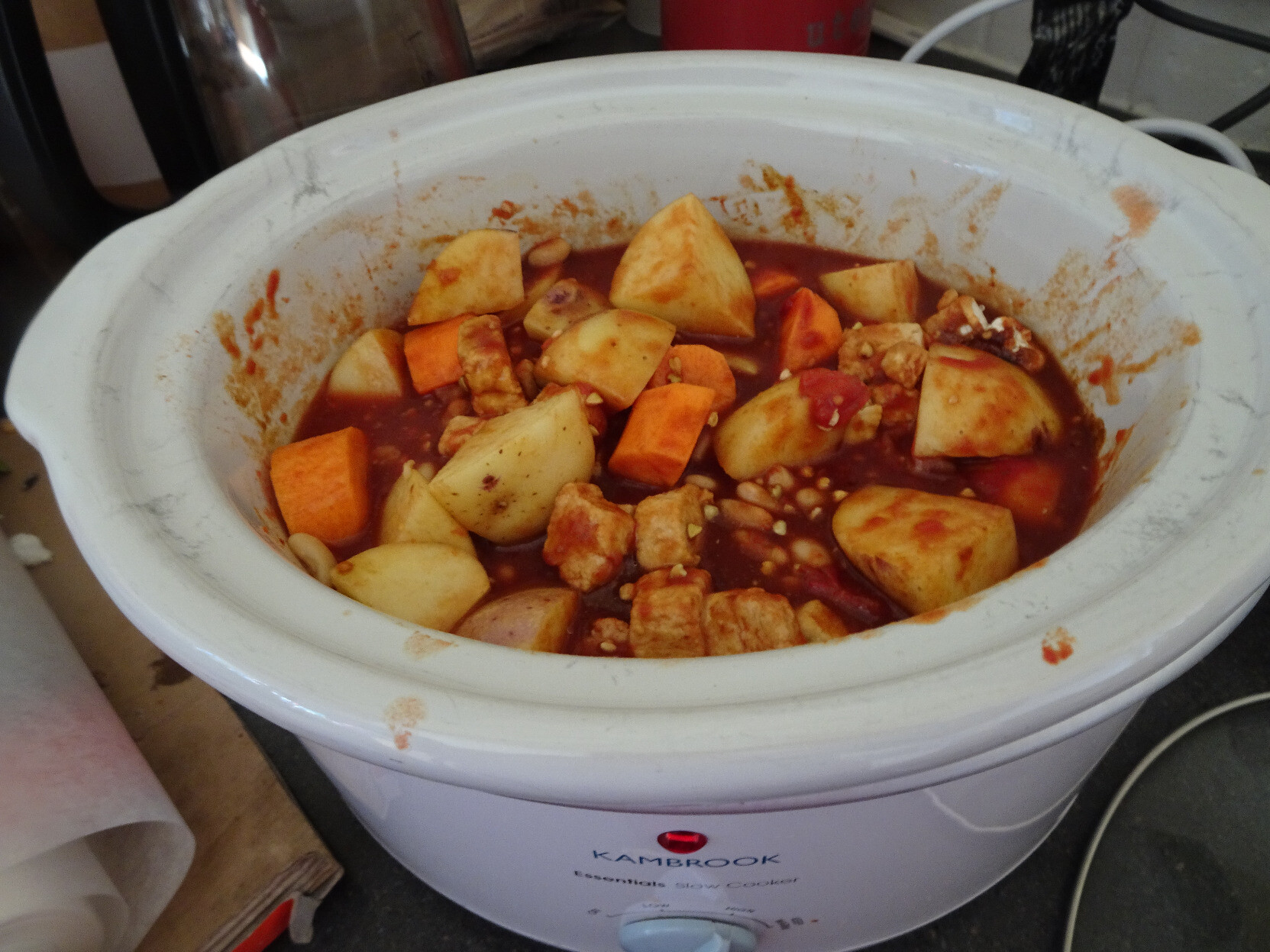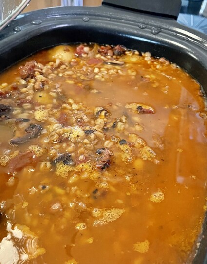Veg cholent in the slow cooker. So many beans and mushrooms and grains and veggies happening.