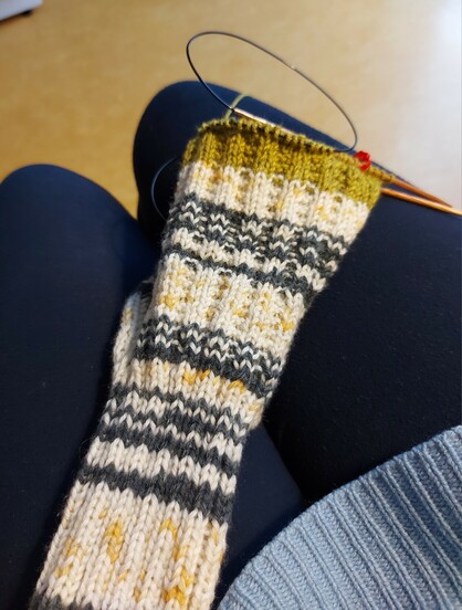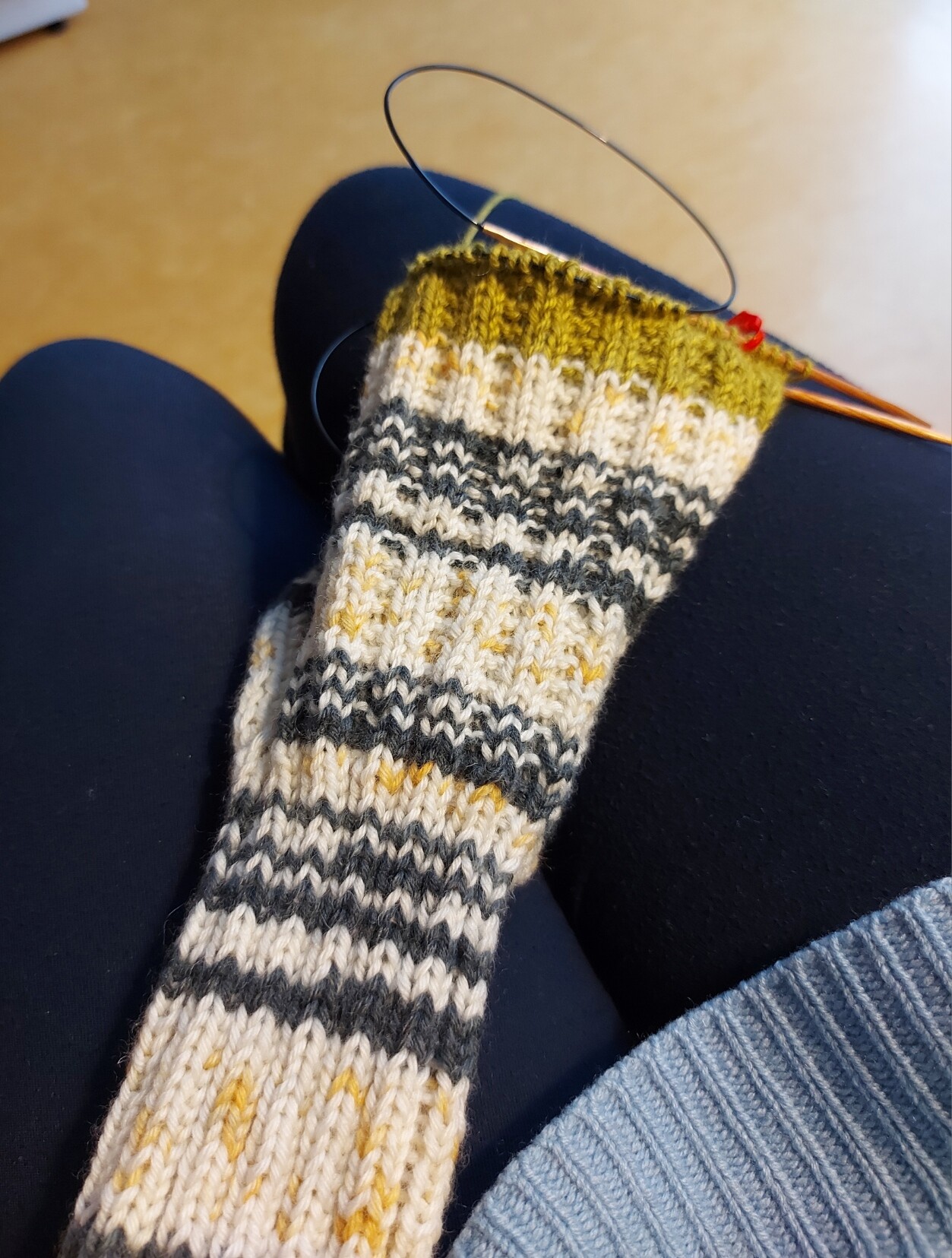 @knitting @fibrearts I am very happy with this pattern by Rachel Coopley! Very relaxing knit, just as I hoped. I am also very happy to work with the heel flap, works so much better than anything else for me. And you might not see this but there are three different structural patterns in this sock which keep me alert enough not to get bored. Maybe I will become a sock knitter after all?