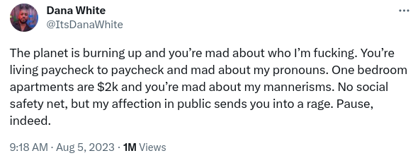 Dana White are absolutely right, but that's exactly the point: distract people with their individual prejudices and perceived injuries so they find it impossible to comprehend how they're being ground down by the same system they uphold; so that they make hurting those whose very existence 'offends their values' more important and more urgent than improving their own lives. (See: Dying of Whiteness/"at least I'm white")