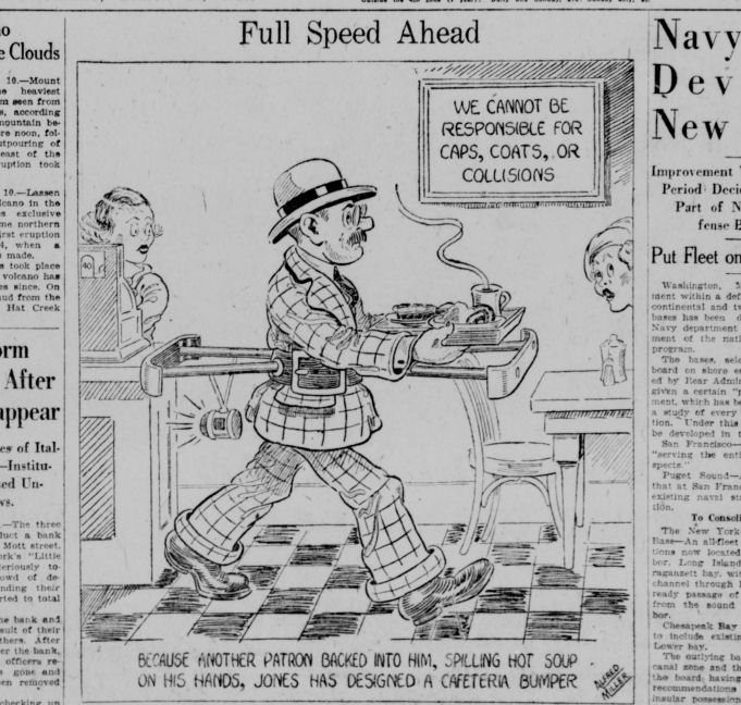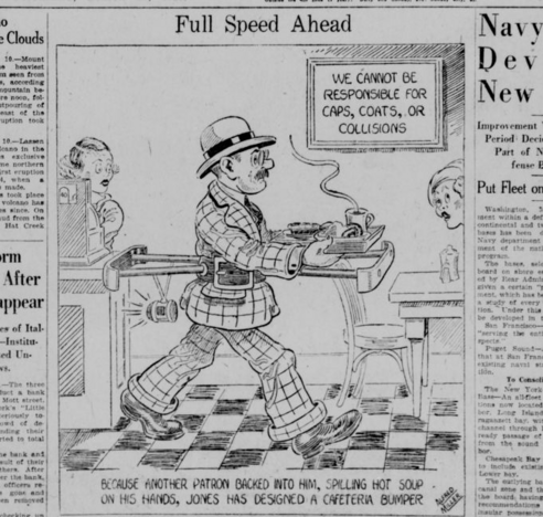 A cafeteria bumper - a cartoonist sees the funny side of life in this American newspaper cartoon that appeared on this day in 1923