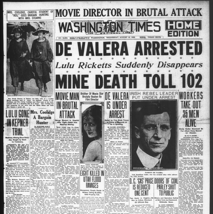 American newspaper headlines #OTD 1923 lead with the arrest of Eamon de Valera's by Free State troops in Ennis Co. Clare
