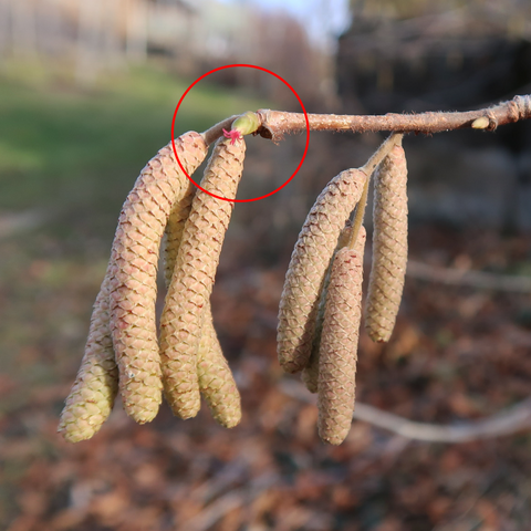 Nel nocciolo (Corylus avellana), i fiori maschili (i grappoli) e quelli femminili (i ciuffetti rossi) appaiono sulla stessa pianta (pianta #monoica),