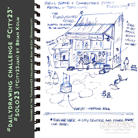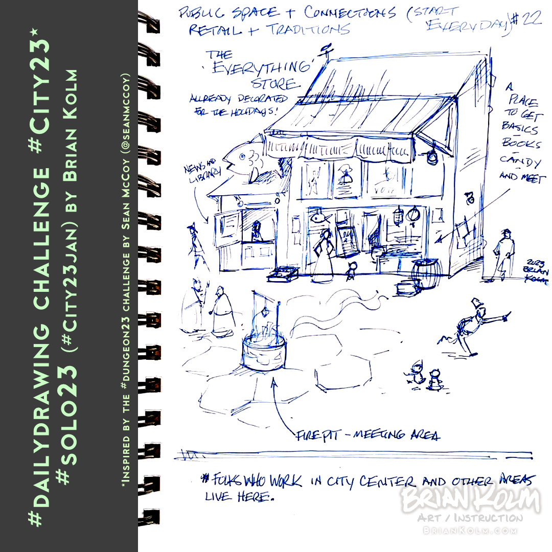 This week the #city23 worldbuilding #drawing prompt: Jan 22-28 Everyday - public space + connections, retail + tradition.