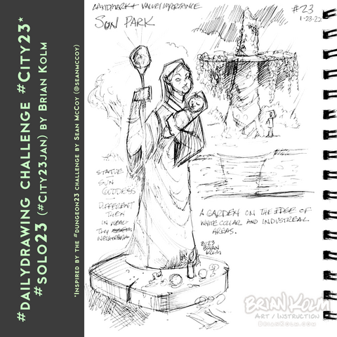 No.23- Sun park is a place with a tall rock spire with a 'brim' covered flowering vines, that can protect folks form the sun and rain. Here we see a statue of the Sun Goddess as an older women holding a baby. This park lies somewhere the white collar area blends in the industrial area.