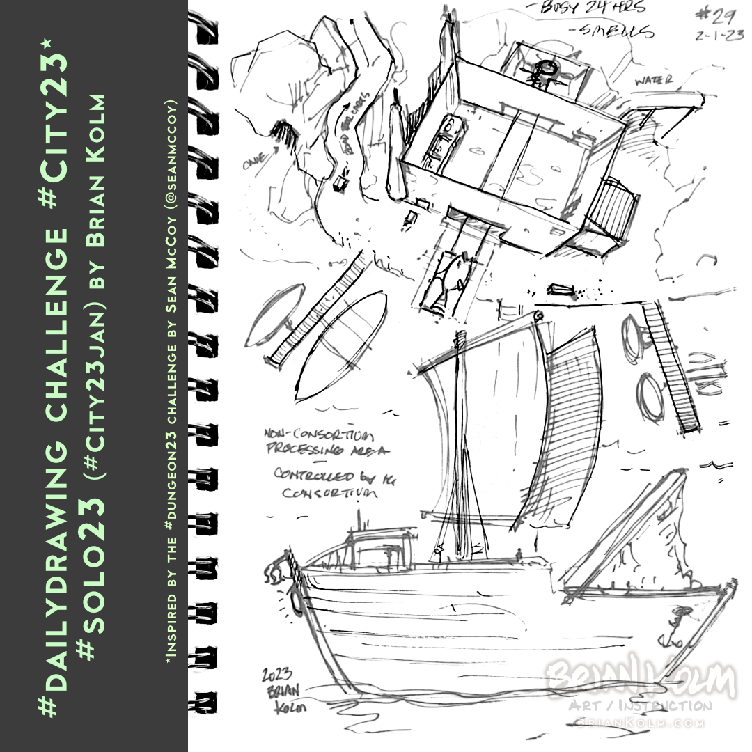 No.29 - These last three drawings are adding things that I did not draw from prompts that I felt needed to be there. Here is the non-consortium area for processing giant sea creatures. This is the docs for everyone else in the city with a boat.