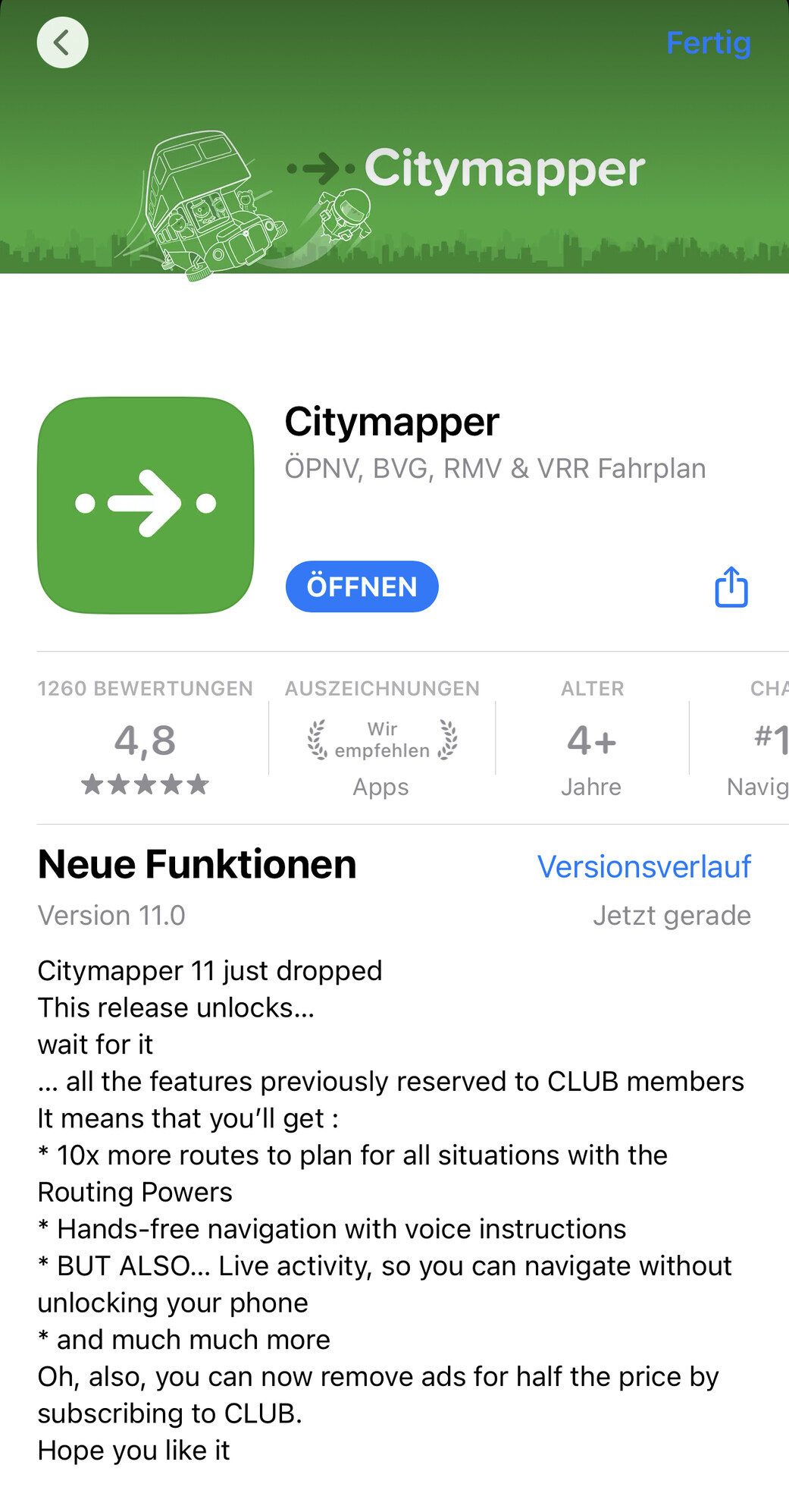 Vor einiger Zeit schon bin ich bei Mikka neben vielen Argumenten für eine Apple Watch Ultra - obwohl ich keine Taucher bin - auf die App Citymapper aufmerksam geworden. Ergebnis der Lektüre war dann, dass meine nächste Apple Watch eine Ultra wird (nächstes Jahr dann) und ich mir Citymapper installiert habe.