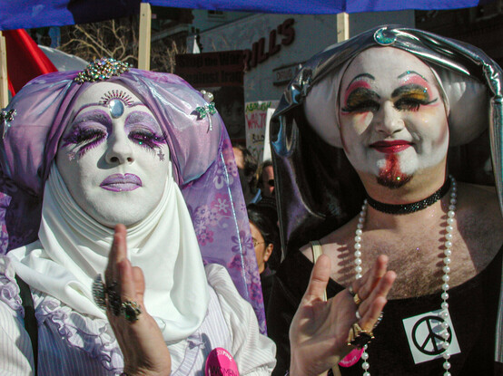 For #ThrowbackThursday, two Sisters of Perpetual Indulgence at a protest against the invasion of Iraq, San Francisco Civic Center, Feb. 7, 2003.