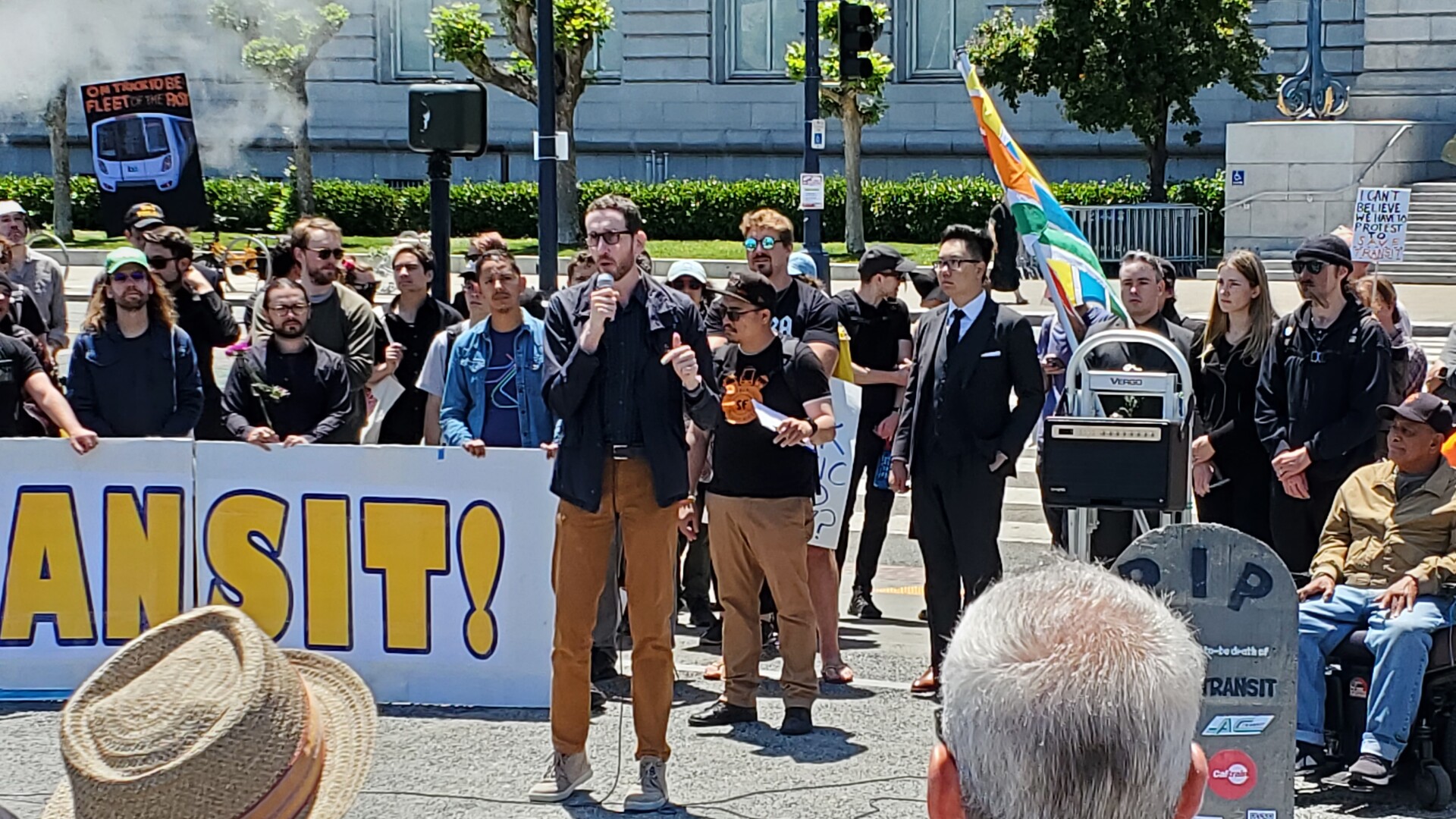 Today @deanpreston joins with State Sen Scott Wiener speaks to defend #transit. "Today the senator speaks for me" #sanfrancisco #CivicCenter