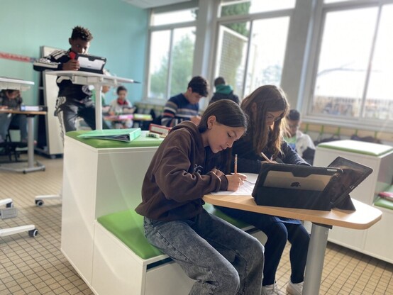 Les 6e au travail dans la salle flexible du collège #Ducos lors d’une séance avec un plan de travail. #classeflexible