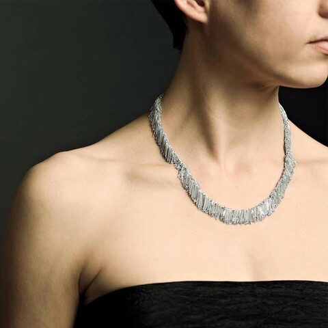 Claudia Milic worked her magic and has spun fine sterling silver chain into this luxurious and velvety looking neckpiece. The white rhodium finish adds an antique patina to the silver. It is a stunning addition to any outfit, adding a touch of old world glamour in a unique and contemporary form