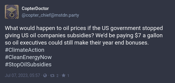 What would happen to oil prices if the US government stopped giving US oil companies subsidies? We’d be paying $7 a gallon so oil executives could still make their year end bonuses. #ClimateAction