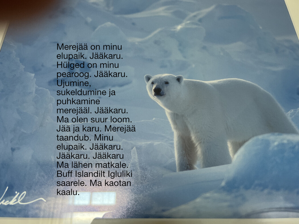#Merijää on elinympäristöni. #Jääkarhu. Hylkeet ovat pääruokani. Jääkarhu. Uiminen ja sukeltaminen ja lepääminen merijäälautoilla. Jääkarhu. Olen iso eläin. Jää ja karhu. Merijää vetäytyy. Minun elinympäristöni. Jääkarhu. Jääkarhu. Jääkarhu Menen patikoimaan. Baffinsaari - Igloolik. Olen laihtumassa. Minulla on nälkä. Minulla on kova nälkä. Mutta ei kauaa. Kiväärin piipun ja jääkarhun välissä ei ole elintilaa.